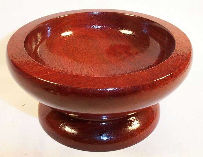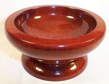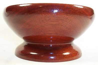 A bloodwood bowl, 6.5" in diameter and 3" high, turned from a single block and finished in polyurethane (several coats). I love this bowl, not because it's anything anyone else would consider particularly special, but because it's the very first bowl I ever turned. It's thick (the whole thing is as thick as the rim) and somewhat clunky because I didn't trust myself or the wood enough to try to make it any thiner. No color correction was done or needed; this is exactly what it looks like, although in anything but a bright ambient light, it looks somewhat darker.