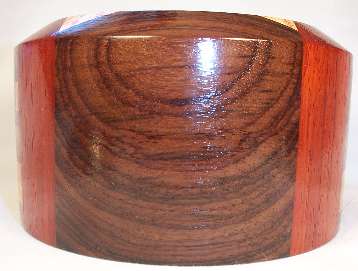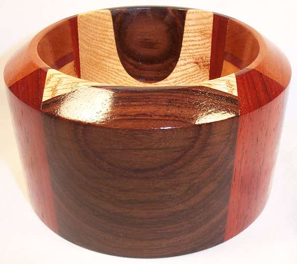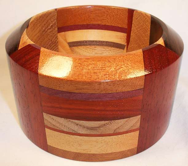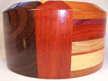 the finish is several coats of polyurethane. kingwood flanked by padauk verticals are padauk and then from the top there's African mahogany, purpleheart, padauk, red oak, padauk (thin), obeche, and African mahogany