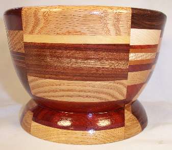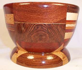 OK, even I might admit that this one is a LITTLE busy, but after a long day of slaving over a hot computer, I find it very relaxing to sand pieces of exotic wood and then glue them together until I have a big enough chunk to put on the lathe, and then just turn it down until something comes out.