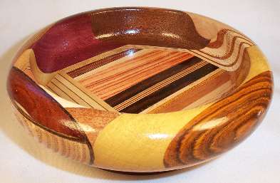 left pic: from the top around the rim clockwise is hard maple, red aromatic cedar, hard maple , a lamination of ash and 1/12" mahogany veneer, pau amerello, cocobolo, back to the pau amerello, a wedge of mahogany, honduras rosewood, and fir. The vertical at left is a lamination of hard maple thins and mahogany veneer. In the center from the top is purpleheart on the left and meranti on the right, then downwards is Honduras rosewood (sapwood on top, heartwood just below), a thin strip of ash, then tulipwood then a lamination of dark cocobolo surrounding veneer, the an ash thin, a mahogany thin, makore, cherry and red oak then down to the pau amerello.