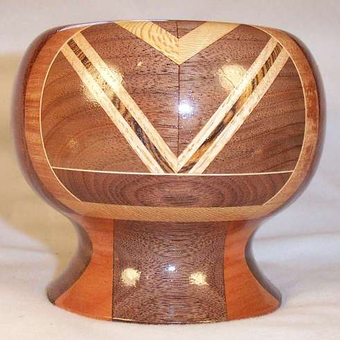 The top "V" is sycamore and the middle "V" is a lamination of bocote and ash thins. The light wood just above the base is sycamore. the dark brown woods are walnut and the rear oval of reddish-brown wood is makore. Note how the makore came out slightly blotchy on the right side.