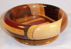 the finish is several coats of polyurethane In the front is padauk over osage orange. The dark wood in the rear is macassar ebony and the base is red oak