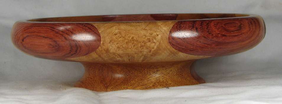 maple burl in front, bubinga on both sides of that, and a mahogany base