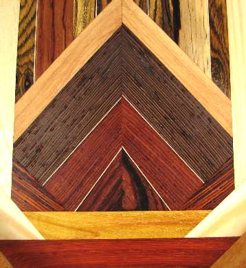 the wedge is quartersawn wenge over quartersawn cocobolo over flat cut cocobolo over osage orange over padauk