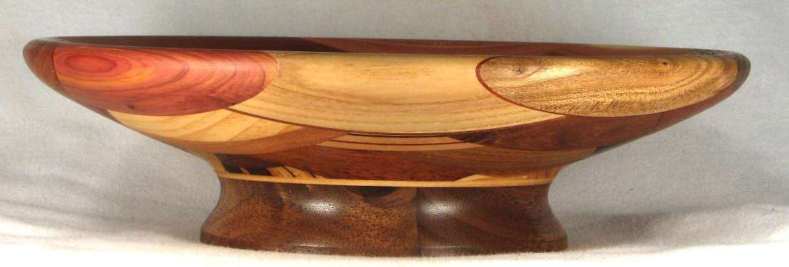 on the right is canarywood backed by padauk veneer and on the left is aromatic red cedar. The base is walnut