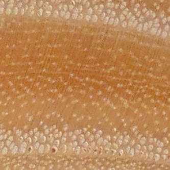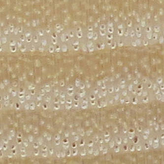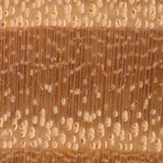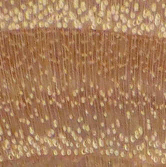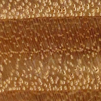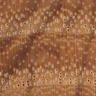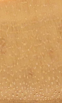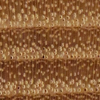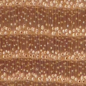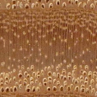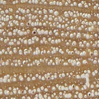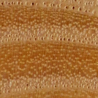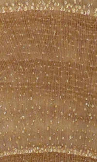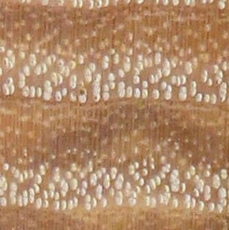 Mexican ash (fresno) / Fraxinus uhdei --- a 1/2" x 1/2" cross section shown here at 6X; although the size of the sample makes the pores looks smaller than they are, they ARE smaller than most ash and they are also sparser than usual and they drop off in size gradually through a large band of earlywood pores, making this look as much like semi-diffuse porous as diffuse porous. The latewood has darker tissue and small pores with diffuse-in-aggregate parenchyma