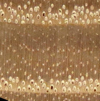 pores: clear strong line of earlywood pores up to several pores thick becoming slightly smaller towards the latewood and then dropping off quickly to much smaller in the latewood