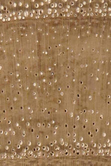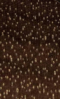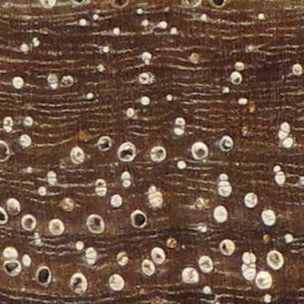 relatively sparse pores, a slightly vague row of earlywood pores that only gradually reduce in size over the course of the year's growth but often not visible even with a 10X loupe. rays are present but hardly visible even with a 10X loupe |