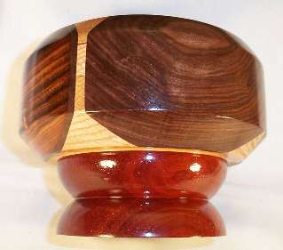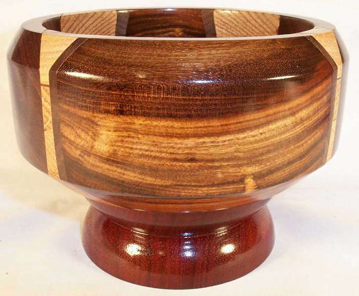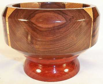 some rosewood that I bought so long ago I've forgotten which one it is (a lot of rosewoods get hard to tell apart). I think it's a very subdued piece of kingwood but I'm not positive. The light center part is red oak and the base is bloodwood.
