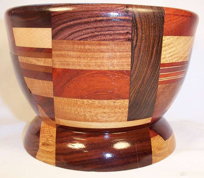 OK, even I might admit that this one is a LITTLE busy, but after a long day of slaving over a hot computer, I find it very relaxing to sand pieces of exotic wood and then glue them together until I have a big enough chunk to put on the lathe, and then just turn it down until something comes out.