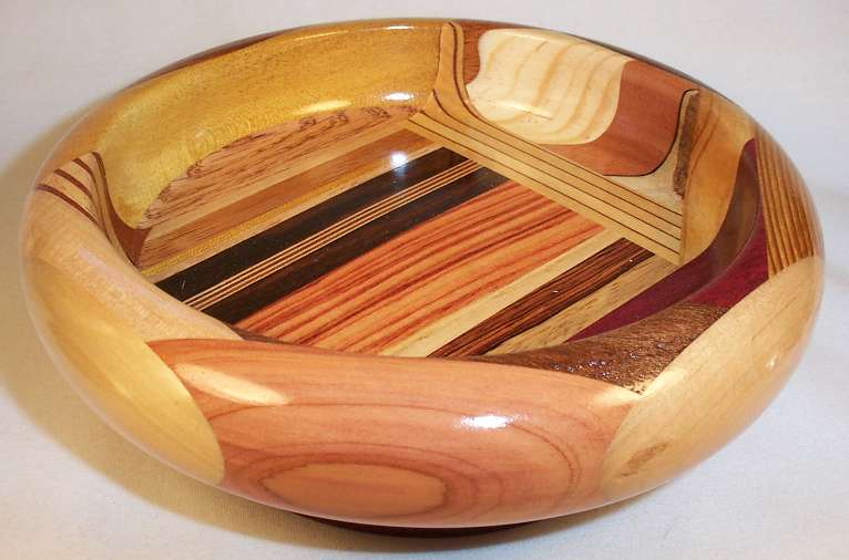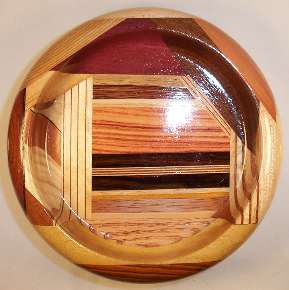 left pic: from the top around the rim clockwise is hard maple, red aromatic cedar, hard maple , a lamination of ash and 1/12" mahogany veneer, pau amerello, cocobolo, back to the pau amerello, a wedge of mahogany, honduras rosewood, and fir. The vertical at left is a lamination of hard maple thins and mahogany veneer. In the center from the top is purpleheart on the left and meranti on the right, then downwards is Honduras rosewood (sapwood on top, heartwood just below), a thin strip of ash, then tulipwood then a lamination of dark cocobolo surrounding veneer, the an ash thin, a mahogany thin, makore, cherry and red oak then down to the pau amerello.
