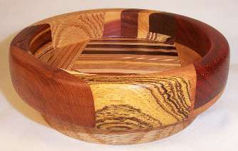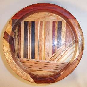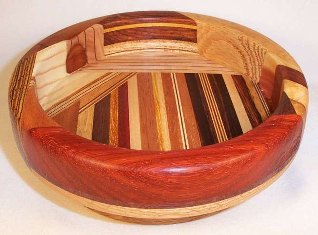 the wood at the front is padauk. The blotchy oval piece at the left rear is western red cedar, which is one of the few woods that sometimes degrades in appearance with the application of finishing agents. More details of that are shown on the western red cedar page.