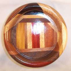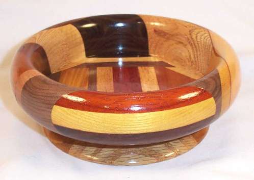 the finish is several coats of polyurethane In the front is padauk over osage orange. The dark wood in the rear is macassar ebony and the base is red oak