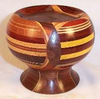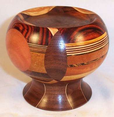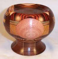 In the left pic, the oval is makore backed by a beautiful piece of cocobolo above a lamination of hard maple, walnut and mahogany, all above a piece of movingui
