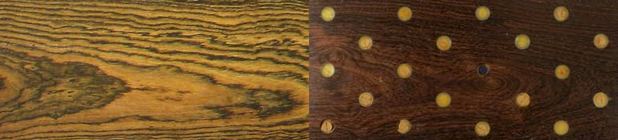 The pic on the right is of the bottom of a bobbin holder (thus the dowel pins) that I made for my wife out of a piece of bocote that came from the other end of the plank shown in raw form on the left. The bobbin holder was finished with a coat of tung oil and exposed to oxygen and indirect sunlight for about 6 years. The dark lines stayed pretty much the same but the nice golden color darkened to what in a bright light (such as for this pic) is a chocolate brown and which in natural light looks almost black.