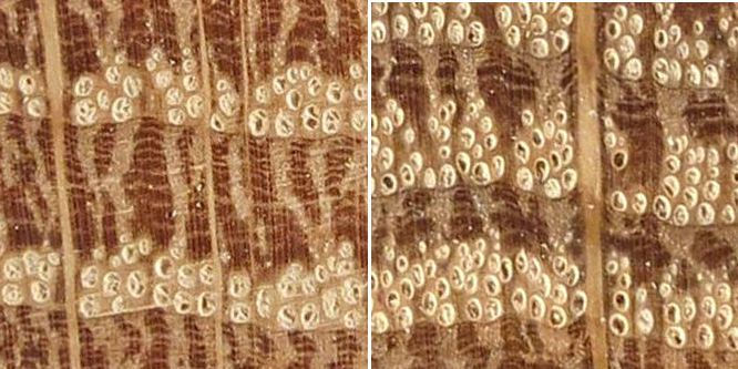 | red oak (very little tyloses) | two views of white oak with plentiful tyloses | |