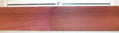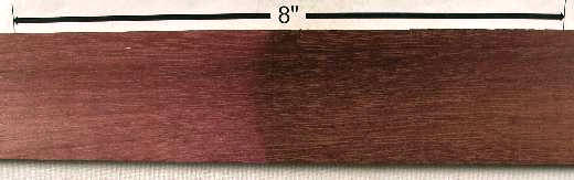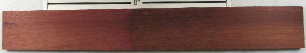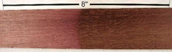 after 1 week with the right side exposed to direct sunlight (behind window glass) for a few hours a day and the left side covered --- interestingly enough, and to my surprise, the subsequent weeks showed the bright purple that developed after a week began to brown out and as you'll see below, by 12 weeks it had lost most of the purple. Also note that the vague area just to the left of the fully exposed area still shows some bright purple after 12 weeks and even after 6 months.