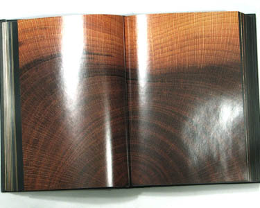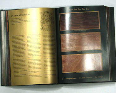 Presented to the left of this text are images of the cover, one each of the gold-background and the black-background pages, and one of the occasional pages that show an enlargement of one of the woods. Except for the cover image, you can click on the images and see a pretty much full-size enlargement. Keep in mind that these images were taken in a bright light, so the gold on black pages are readable here in a way that they are not in a more normal light.