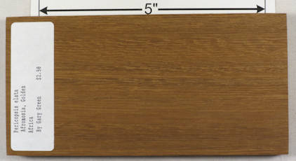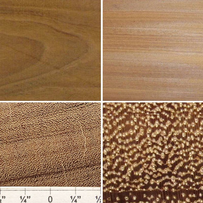 | afrormosia / Pericopsis spp. (previously Afrormosia spp.) 5" x 5" flat cut, 5" x 5" quartersawn, 1" wide end grain, and a 1/4" x 1/4" end grain closeup. Diffuse porous with moderately sparse, medium sized pores, randomly distributed with vasicentric parenchyma and considerable confulent parenchyma. Rays are visible at 10X but never with the naked eye. Growth boundaries are sometimes vague but always discernible. ![]() |