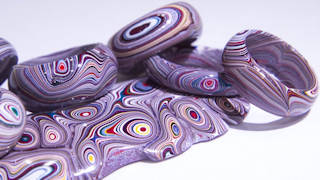 Paraphrased / edited from Wikidpedia Fordite, also known as Detroit agate or Motor City agate, is old automotive paint which has hardened sufficiently to be cut and polished. It was formed from the buildup of layers of enamel paint slag on tracks and skids on which cars were hand spray-painted. As part of the process, it has been baked numerous times. It is often recycled into jewelry, as seen here.