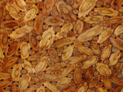 portion of a circular table-top, showing the parquetry cookies cut perpendicular to the branches and filled in, apparently, with something white. Close inspection of the enlargement shows that the cookies were flattened on 4 sides before being placed, and they were laid down in a circular rows.