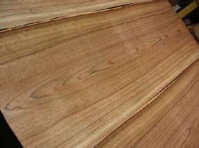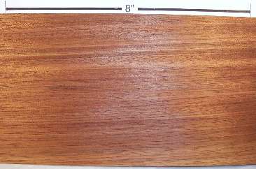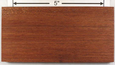 | etimoe / Copaifera salikounda (syn Detarium chevalieri) and Copaifera mildbraedii of the family Fabaceae (syn. Leguminosae) the legume, pea, or bean family 5" x 5" flat cut, 5" x 5" quartersawn, 1" wide end grain, and a 1/4" x 1/4" end grain closeup. I do not know if the woods from the two species are distinguishable or not. Diffuse porous, occasional pore multiples (radial), large pores with vasicentric parenchyma, strong diffuese-in-aggregates parenchyma that sometimes appears to be banded parenchyma, growth rings slightly vague, rays quite obvious at 10X and with medium spacing. This is a West African wood, reportedly used primarily for rubber, but untapped trees are used to produce veneer and lumber. Also, in the USA at least, it is commonly called "African rosewood" although it is not a rosewood or even related to rosewoods. It can have a striking grain pattern and wonderful curly figure. There is also a form called "special etimoe" (yes, that actually is the name) that pretty much deserves the name simply because it doesn't look like any other wood at all (samples shown below). I've had a lot of different eimoe veneers but have never seen it in plank form (other than the 6" long samples shown) janka hardness 1660 (compare to hard maple 1450, white oak 1350) |