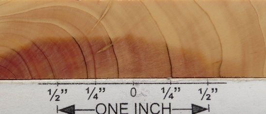 both sides of a sample plank of Pfitzer juniper / Juniperus x pfitzeriana --- HUGE enlargements are present. This sample was loaned to me by Mark Peet whom I thank for this and other contributions to the site.
