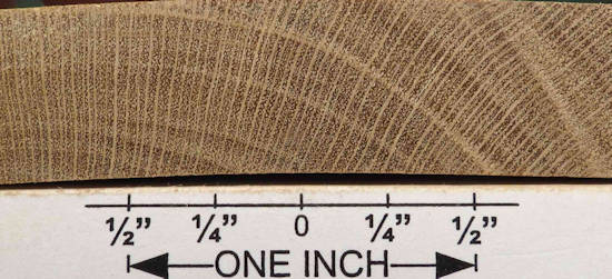 both sides of a sample plank of lemonwood (degame) / Calycophyllum candidissimum --- HUGE enlargements are present. This sample was loaned to me by David Clark whom I thank for this and other contributions to the site.