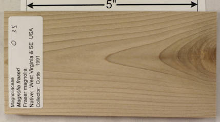 both sides of a sample plank of Fraser magnolia / Magnolia fraseri --- HUGE enlargements are present. This sample was loaned to me by Mark Peet whom I thank for this and other contributions to the site.
