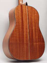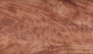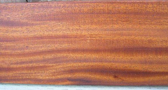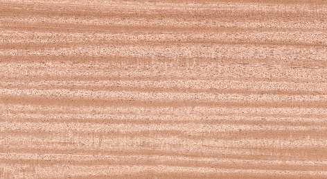 | African mahogany / Khaya spp. see fact sheet for full list of species 5" x 5" flat cut, 5" x 5" quartersawn, 1" wide end grain, and a 1/4" x 1/4" end grain closeup. Diffuse porous with medium pores, fairly sparse, randomly spaced and with obvious vasicentric parenchyma. Growth ring boundaries are are frequently only clear at 10X because they are defined only by marginal parenchyma lines and these fade out but come back and generally can only be seen with a loupe. Frequent radial pore multiples. Rays are moderately thick and fairly closely spaced but result in only small ray flakes on quartersawn surfaces. Graininess varies considerably, probably because there are several species included as "African mahogany" ![]()