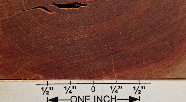 end grain closeups. Because of the hardness of the wood, my sanding down to only 200 grit leaves VERY obvious scratches that pretty much obscure the rays, which are not very strong but which can be seen clearly in the quartersawn shots above. Note that the growth rings are faint, but clearly present. The slightly brighter red of the first pic is accurate.