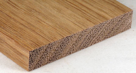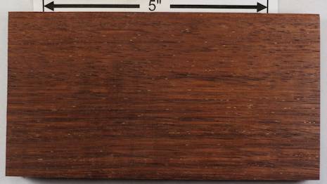 | merbau / Intsia spp. 4" x 4" flat cut, 3" x 3" quartersawn, 1" wide end grain, and a 1/4" x 1/4" end grain closeup. Diffuse porous with large, sparse, randomly spaced pores with lozenge shaped aliform parenchyma, infrequent confulent parenchyma, frequent pore multiples in random directions, banded parenchyma (marginal?), rays tightly spaced and clearly visible at 10X, growth ring boundaries vague to distinct. ![]() |