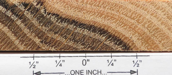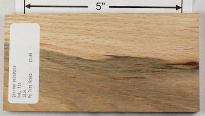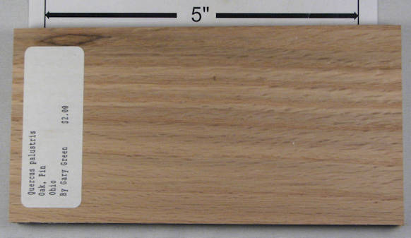 both sides of a sample plank of pin oak / Quercus palustris --- HUGE enlargements are present. This sample was loaned to me by David Clark whom I thank for this and other contributions to the site. The unlabeled side of this piece is totally covered with what is either mineral stain or blue stain.