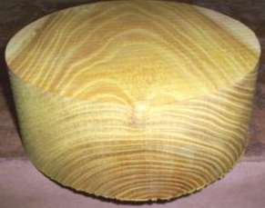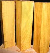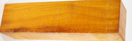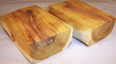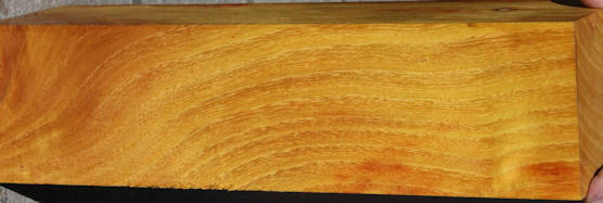 The first one has been sanded with 120-grit, prior to which it looked just as yellow, only rougher, so the sanding did not enhance the color as it does with some woods. The 2nd one is end grain and has been long exposed to the air, showing the typical darkening of the species (the darkening is more pronounced on the end grain than on surface grain). When I got this piece (maybe 15 years ago), the end grain wasn't this dark. The end grain on the first piece has closer growth rings and is considerably lighter in color than the 2nd piece. No color correction has been used here, but the colors are quite accurate.