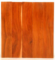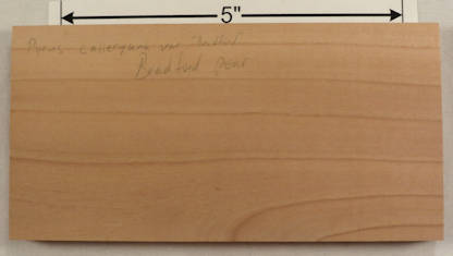 | pearwood / Pyrus spp. of the family Rosaceae 3" x 3" flat cut, 2.5" x 2.5" quartersawn, 3/4" wide end grain, and a 1/4" x 1/4" end grain closeup. Diffuse porous with solitary "uncountable" pores (i.e. VERY small pores randomly arranged), growth ring boundaries often quite faint but generally visible even to the naked eye, rays not visible at 10X Reportedly there are about 20 species of pear that grow in North America, Europe, and parts of western and southeast Asia. Most are fruit trees, all are small by lumber standards, and at least one, the Bradford pear (Pyrus calleryana) is a fruitless ornamental tree. Also, to remain technically correct, I should point out that Bradford pear is NOT technically just "Pyrus calleryana", it is a cultivar of that species and the formal name is "Pyrus calleryana var Bradford". My own use of just Pyrus calleryana throughout this site follows the common convention used by almost all wood/woodworking sites in the USA. The exceptionally fine, smooth, texture make this an ideal wood for carving, and since the tree is small this wood is pretty much limited to carving, turning, and small ornamental objects. Lumber and veneer production is mostly from the common pear (Pyrus communis) and the Swiss pear (Pyrus nivalis). The veneer, when steamed as it often is, takes on a brighter pink color than un-steamed. Reportedly subject to severe twisting during drying. |