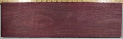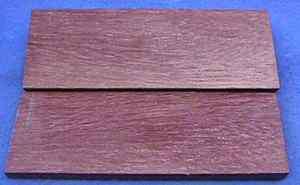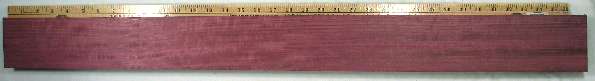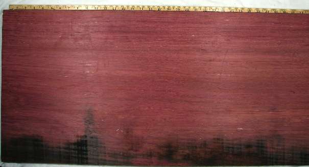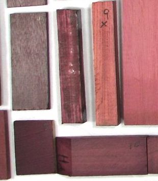 | purpleheart / Peltogyne spp. (at least 20 species) 5" x 5" flat cut, 5" x 5" quartersawn, 1" wide end grain, and a 1/4" x 1/4" end grain closeup. Diffuse porous with fairly large sparse pores having lozenge shaped aliform parenchyma and vague growth ring boundaries. Sometimes seemingly marginal parenchyma is present and the degree of confluence joining the pores varies a fair amount. Rays are obvious at 10X. The best description I've seen of the brown/purple colors in purpleheart. This is from Eric, a moderator on The WoodTalk Forum: Yeah purpleheart is weird stuff...I've seen it go both ways. We have some incredibly purple - like clownishly purple - boards come into the yard sometimes, and after a couple months some of them will begin to turn brown and others will stay purple. I've sent a totally brown piece through the planer and it's come out purple...and I've sent a very purple piece through and it's come out brown. I can't figure it out. Like Eric, I can't figure it out either except to generically attribute it to the fact that there are quite a number of species that share the common name purpleheart, and there are varied growing conditions. ![]() |