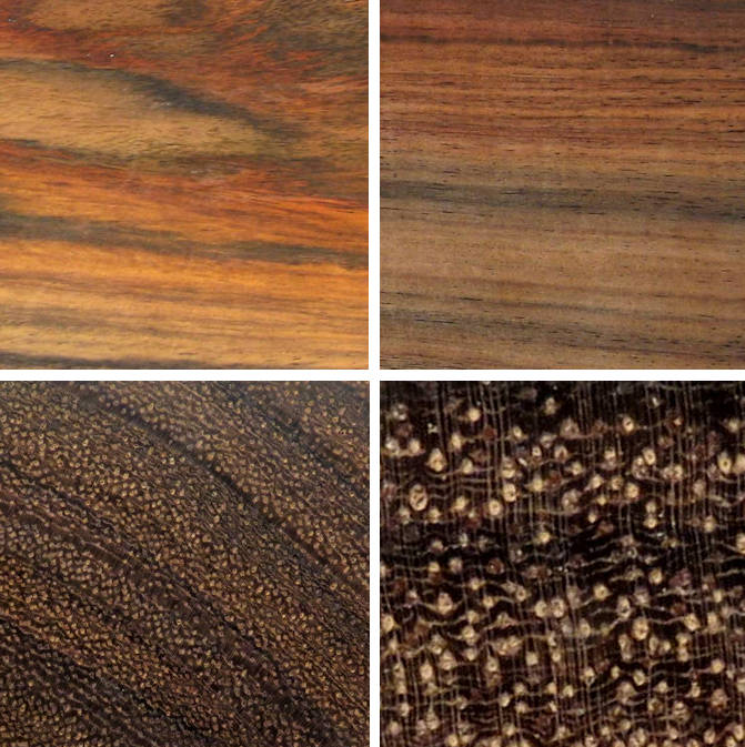 | East Indian rosewood / Dalbergia latifolia of the family Fabaceae (the legume family) 3" x 3" flat cut, 3" x 3" quartersawn, 1" x 1" end grain, and a 1/4" x 1/4" end grain closeup. Diffuse porous with medium sized, randomly spaced pores with winged aliform parenchyma (occasionally lozenge shaped) with some confluence and considerable diffuse-in-aggregates parenchyma. Occasional pore multiples (radial), tightly spaced rays are thin but generally visible at 10X, growth ring boundaries range from vague to well defined. ![]()