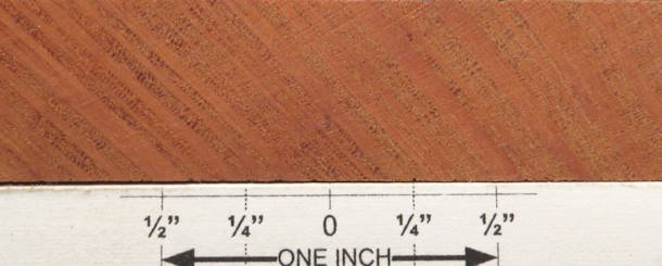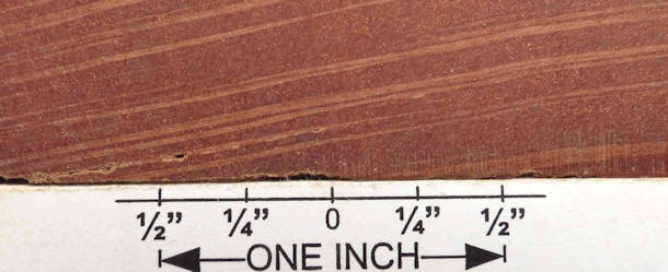 both sides of a sample plank of bull-oak (aka bull sheoak) / Allocasuarina luehmannii --- HUGE enlargements are present. This sample was loaned to me by Mark Peet whom I thank for this and other contributions to the site. The difference in color between the two sides is because the labeled side has a slightly dull patina whereas the second side is freshly sanded to 240 grit and has a glass-like finish (this wood is very dense/heavy)