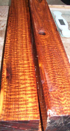 both sides of a sample plank of snakewood / Piratinera guianensis --- HUGE enlargements are present. This sample was loaned to me by David Clark whom I thank for this and other contributions to the site. The labeled side is raw and has a light patina but the 2nd side has been freshly sanded to 400 grit and although you can't tell from the pics, it took a high polish even at just 400 grit. Had I buffed it, it would be like glass.