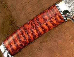 a particularly nice Damascus steel blade w/ a snakewood handle; both levels of enlargement are present.