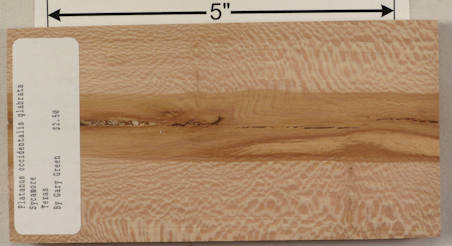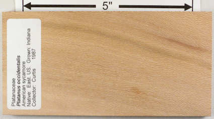 | sycamore / Platanus occidentalis, Platanus racemosa, and Platanus wrightii of the family Plantanaceae. 5" x 5" flat cut, 5" x 5" quartersawn, 3/4" wide end grain, and a 1/4" x 1/4" end grain closeup. Diffuse porous with small pores in random distribution, rays thick enough to be seen with the naked eye, growth ring boundaries are usually weak but discernible, partially because there is marginal parenchyma. Along with white oak, sycamore produces the most striking ray flakes of all North American woods, as can be seen in some of the pics on this page. ![]() |