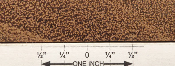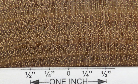 both sides of a piece of tatajuba / Bagassa guianensis --- HUGE enlargements are present. This sample was loaned to me by Mark Peet whom I thank for this and other contributions to the site. Note that the first face was sanded to 240 grit and the second face was not and this accounts for the significant difference in color between the two (the second face still has a patina) and the better resolution of the detail characteristics as seen in the first one.