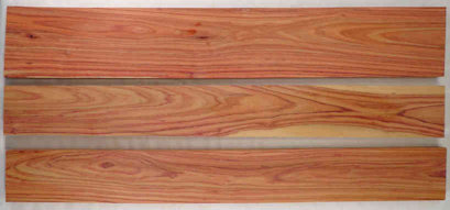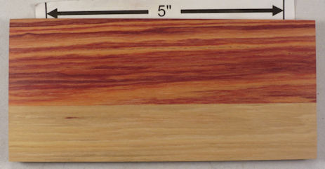| tulipwood / Dalbergia decipularis and Dalbergia frutescens see fact sheet for a considerable discussion on the botanical name(s) 4" x 4" flat cut, 4" x 4" quartersawn, 1" x 1" end grain, and a 1/4" x 1/4" end grain closeup. Semi ring porous with medium sized earlywood pores and small latewood pores, all with thin vasicentric parenchyma, some pore multiples. Growth ring boundaries range from indistinct to discernible. Very thin rays, sometimes hard to see even at 10X. Diffuse-in-aggregates parenchyma often present, often hard to see, rare occurrences of winged aliform parenchyma One of the most consistently beautiful rosewoods ![]() NOTE: There is some confusion about the botanical names (see the Fact Sheet) but bOth The Plant List and the GRIN database agree that Dalbergia decipularis and Dalbergia frutescens are accepted names of separate species with Dalbergia variabilis being a synonym for Dalbergia frutescens. The GRIN database, however, does not list tulipwood as one of the common names for Dalbergia frutescens but rather calls it jacaranda-rosa. In keeping with common usage, I consider them both to be tulipwood whether they are separate species or not. In the "web pics" section of this page, I often did not make a note of whether a wood was called one species or the other since as far as I can tell, even if they are separate species, I can't tell them apart. |