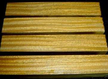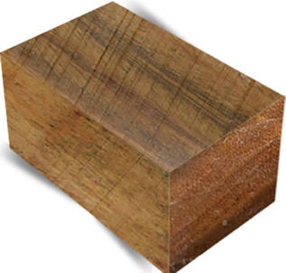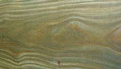 | verawood / Bulnesia arborea and Bulnesia sarmientoi of the family Zygophyllaceae Another widely used name for this wood is "Argentine lignum vitae" but this wood is not related to true lignum vitae and is very easy to distinguish from it (see the link below this box) 2.5" x 2.5" flat cut, 2.5" x 2.5" quartersawn, 1" wide end grain, and a 1/4" x 1/4" end grain closeup. Diffuse porous with with moderate pore size and density and pores arranged in dendritic groups. Rays are not visible. The face grain generally, as in these samples, clearly shows the "feathering" / "herringbone" characteristic of interlocked grain. The wood is very hard and dense (it sinks in water) and is so waxy that is clogs sandpaper pretty quickly and can be hard to glue. I have found it very pleasant to turn on the lathe and most reports agree that it is easy to turn but say it is otherwise hard to work. Color change is a bit weird in that it sometimes starts off brown and then turns green and other times starts off green and turns reddish brown. Both of those are exhibited on this page. I have no explanation for this radical difference in color change except that perhaps it is the difference between Bulnesia arborea and Bulnesia sarmientoi. |